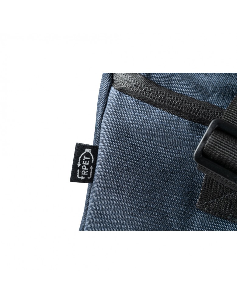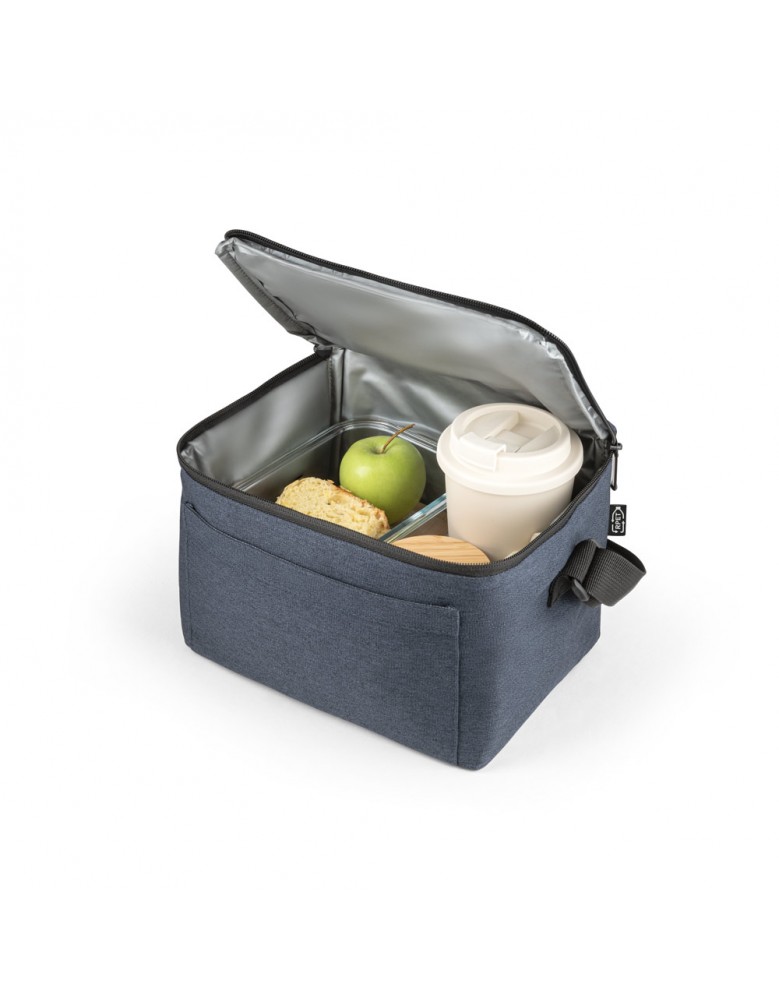 Bolsa térmica em rPET 600D com interior em PEVA. Alça ajustável em webbing, bolso frontal e fecho duplo. Capacidade até 7 L. 240 x 170 x 170 mm