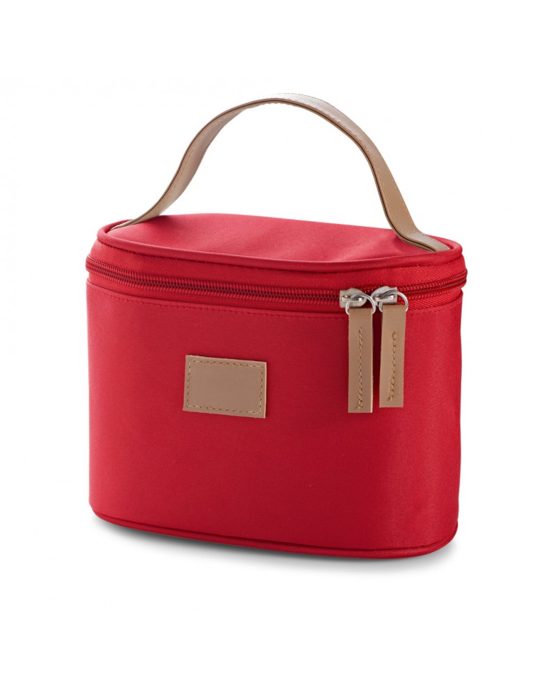 Com alça para carregar e fechamento com zíper, a nécessaire em microfibra tem detalhe em couro sintético e está disponível em azul, bege ou vermelho.