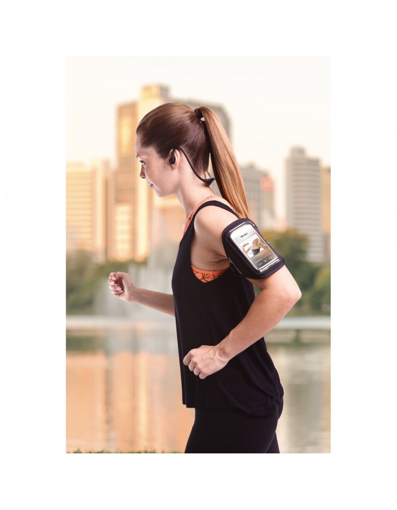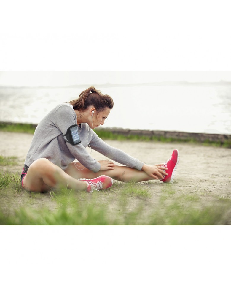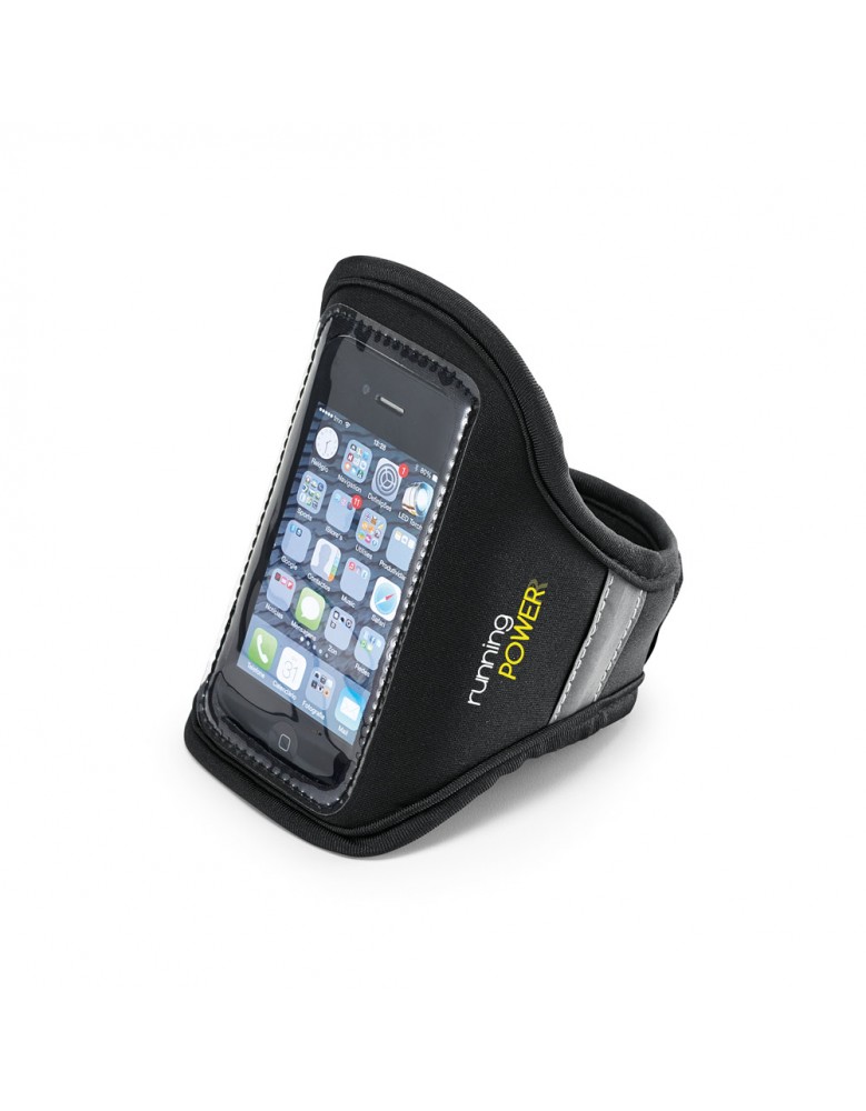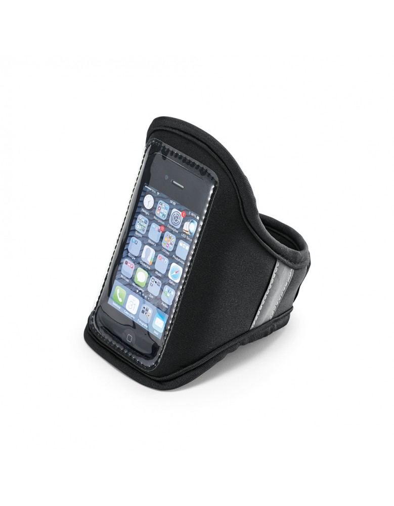 Braçadeira para celular em soft shell com banda refletiva e fechamento ajustável. Para smartphone 5.1''. 450 x 165 mm