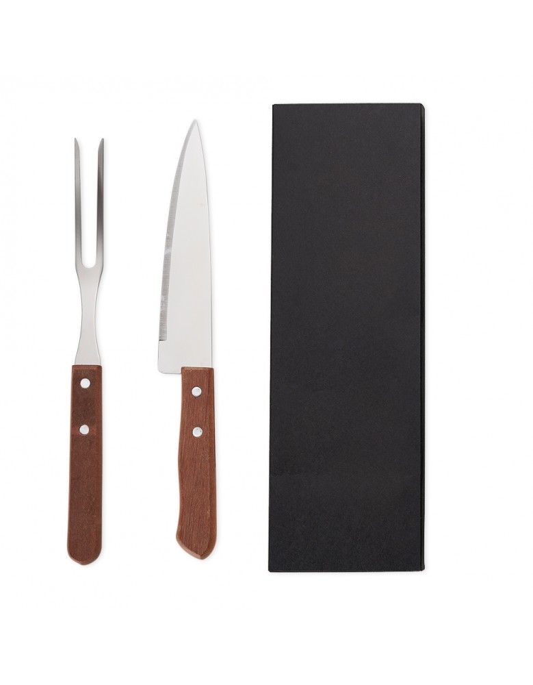 Kit churrasco duas peças em estojo de papel kraft com elásticos de nylon para fixação dos talheres, contém faca e garfo.