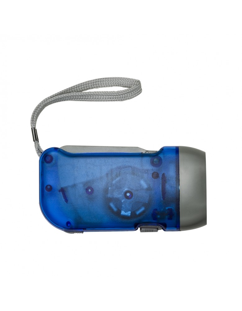 Lanterna plástica com 3 leds, pressionando o “gatilho” gera energia para alimentar a lanterna dínamo. Possui botão para ligar/desligar lanterna, botão para travar gatilho e acompanha cordão.