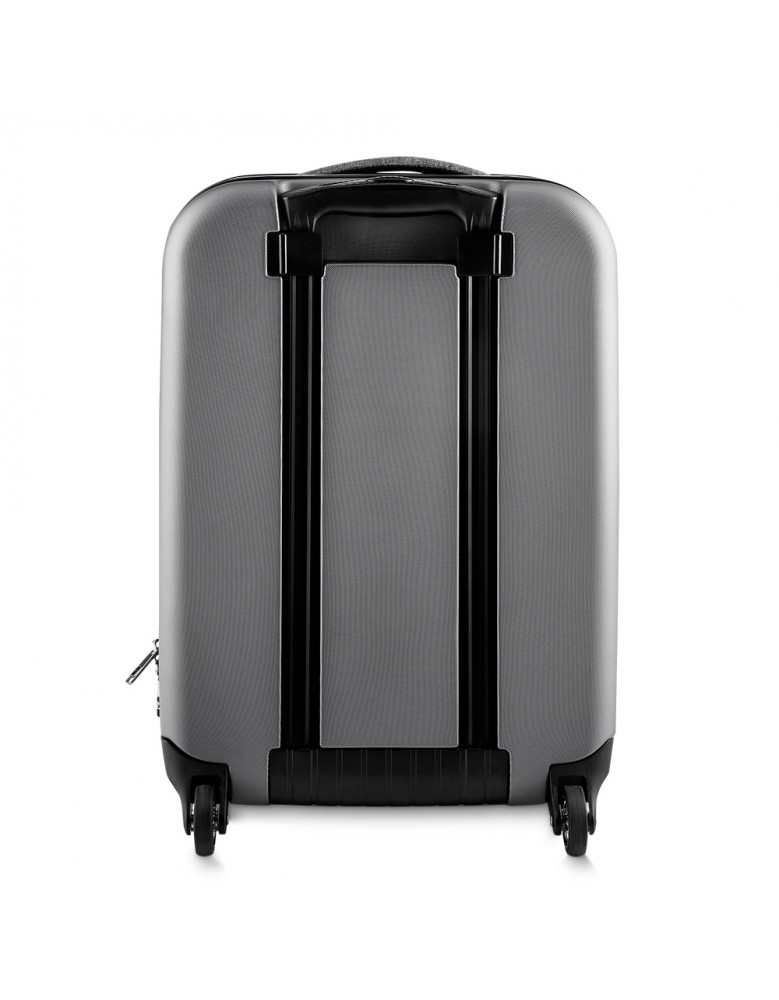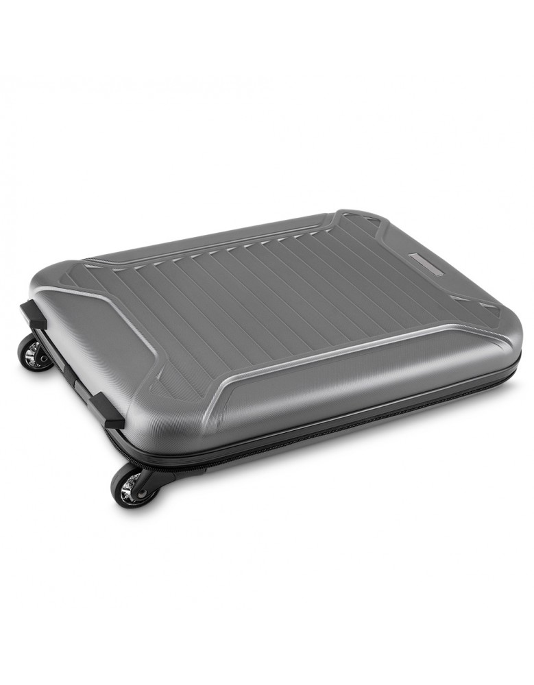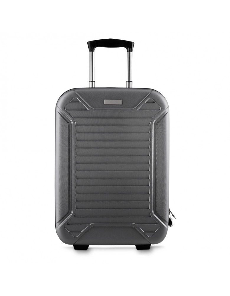 Mala de viagem pequena 43 litros em ABS e lateral em nylon. A mala possui bolso lateral com velcro, alça de carrinho com botão para ajuste de tamanho, alça de mão e cinto protetor na parte interna.