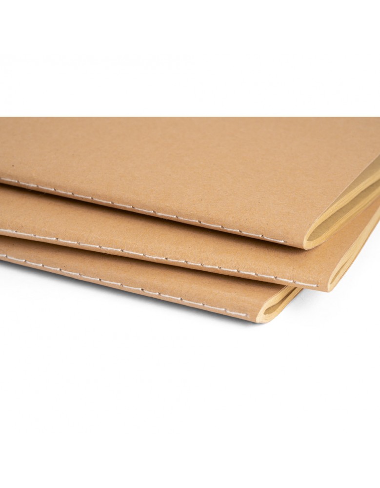 Caderno A6 com capa em cartão (250 g/m²) e cantos redondos. Contém 40 folhas não pautadas, costuradas, em papel reciclado proveniente de gestão florestal sustentável. 100 x 145 mm