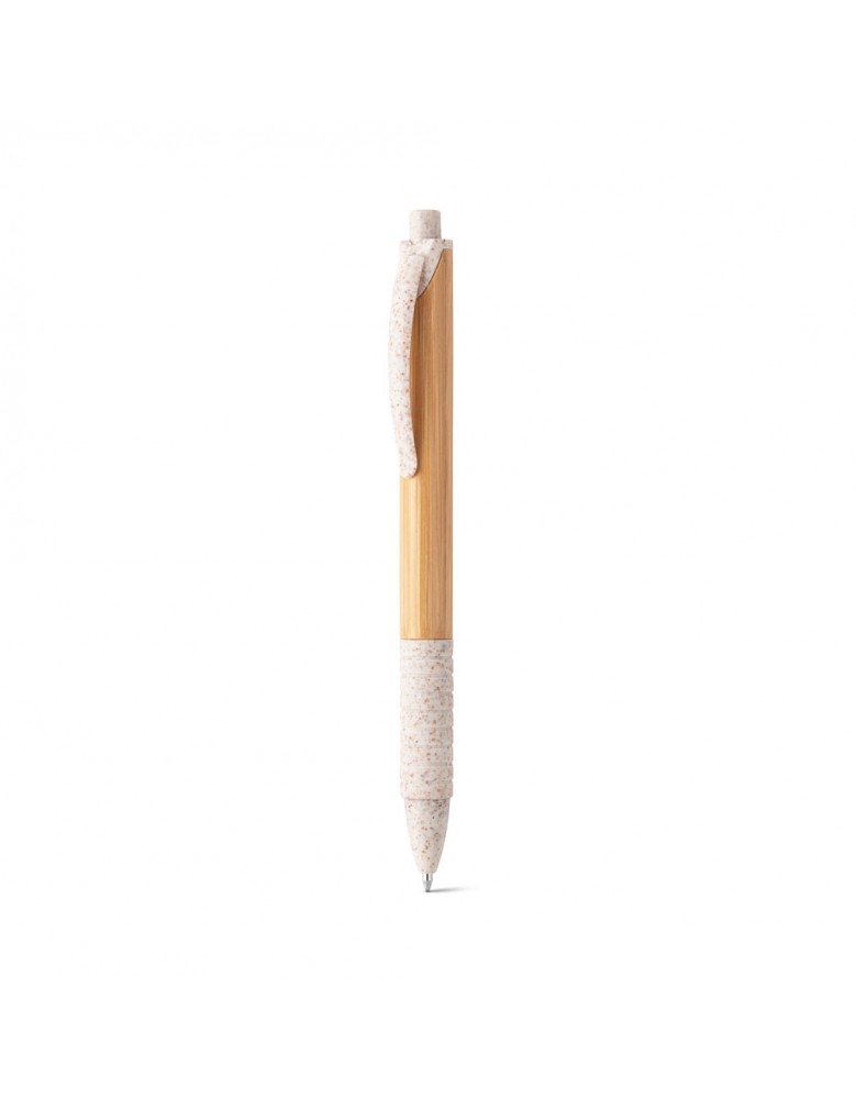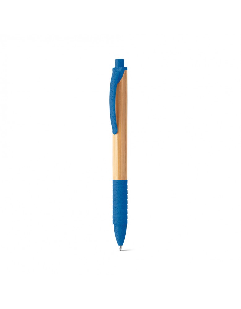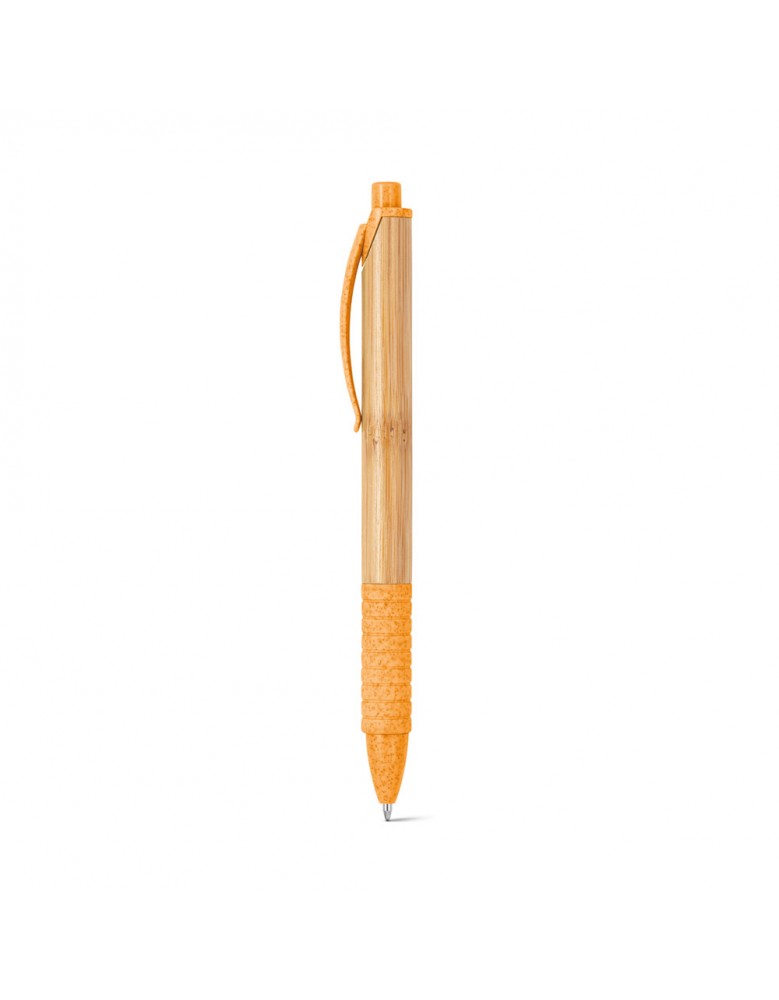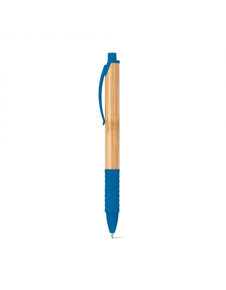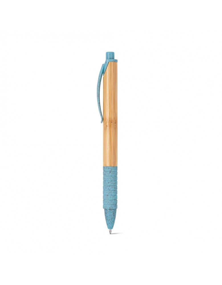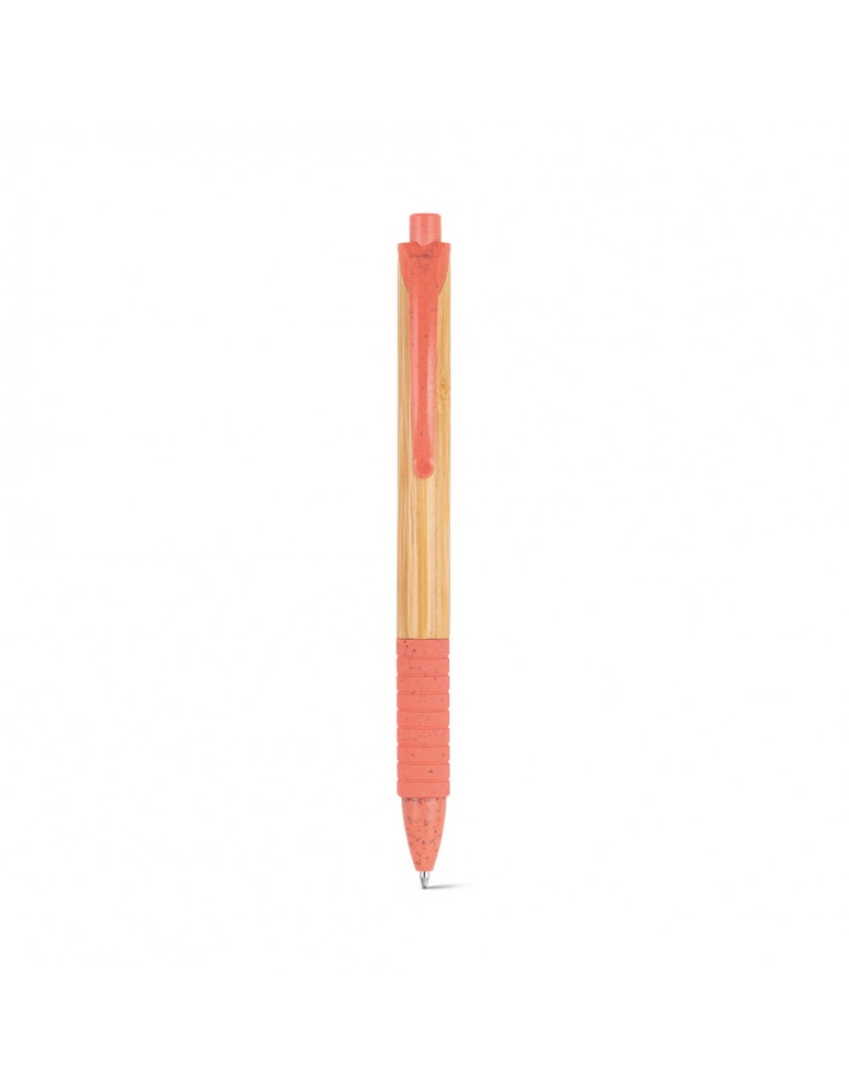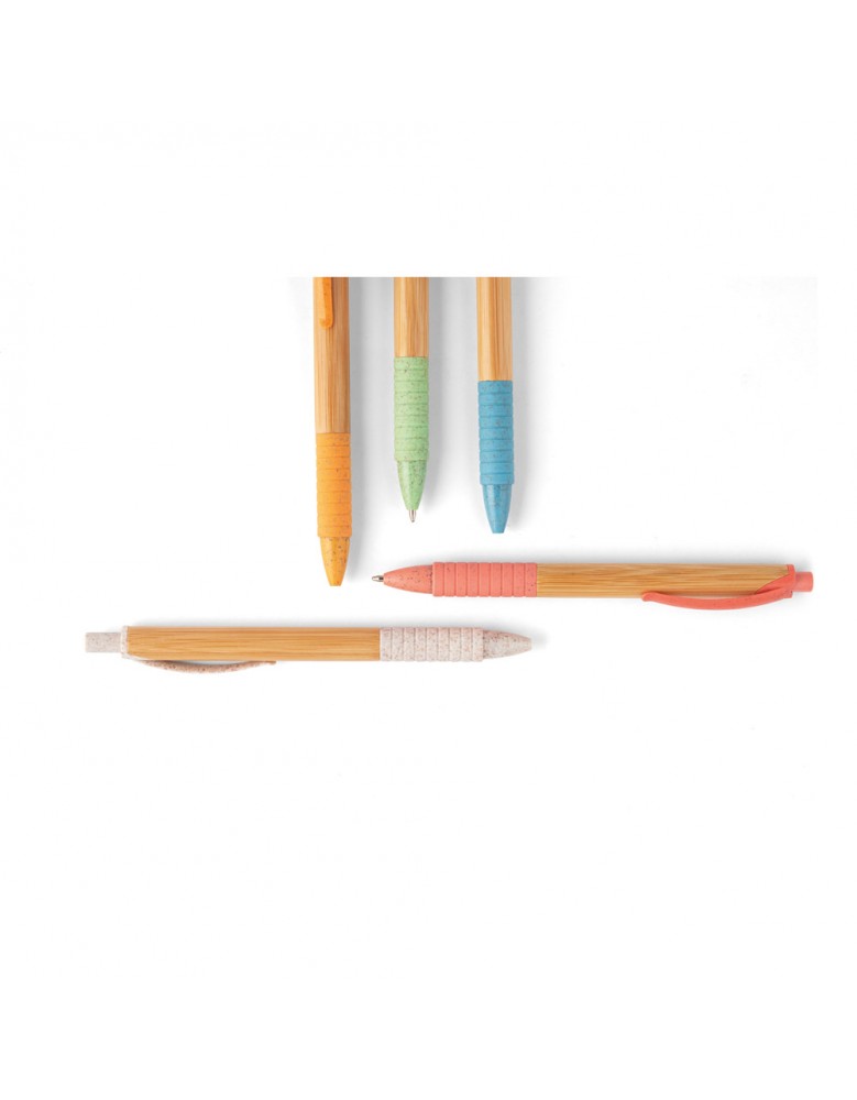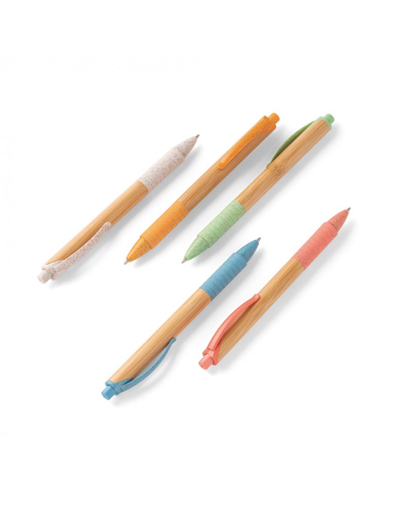 Esferográfica em bambu com clipe, antideslizante e elementos coloridos em fibra de trigo e ABS. Até 1,5 km de escrita. ø11 x 142 mm