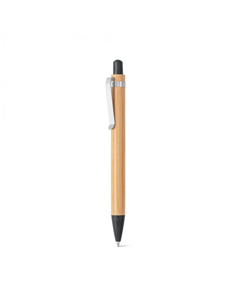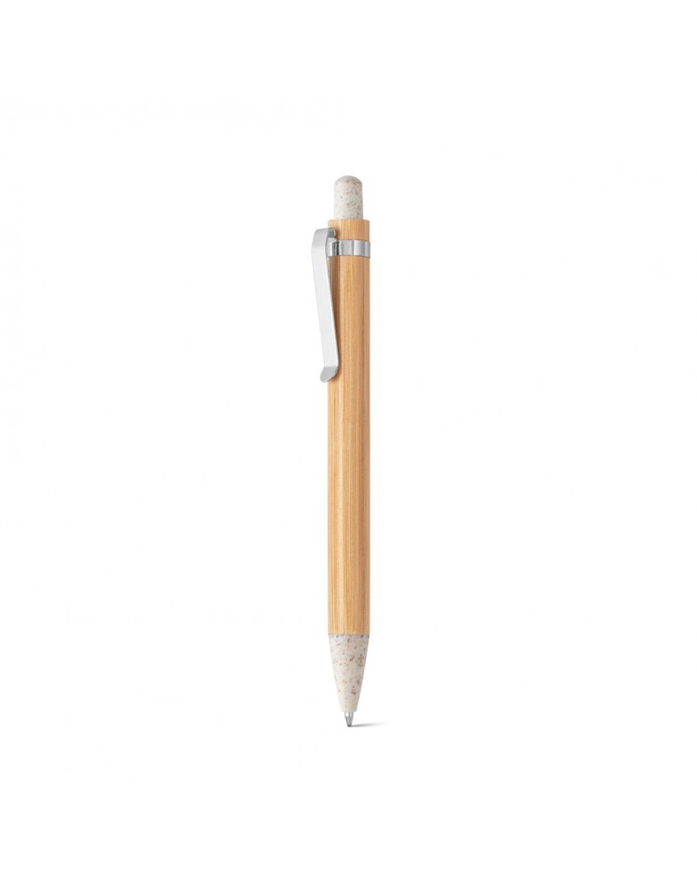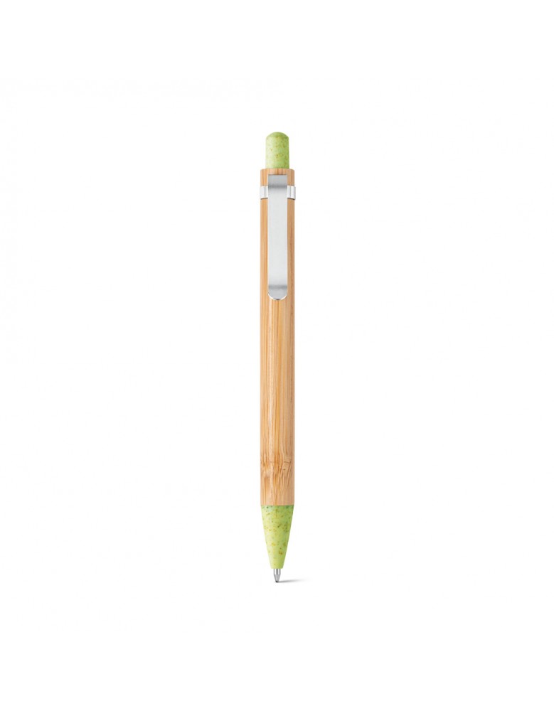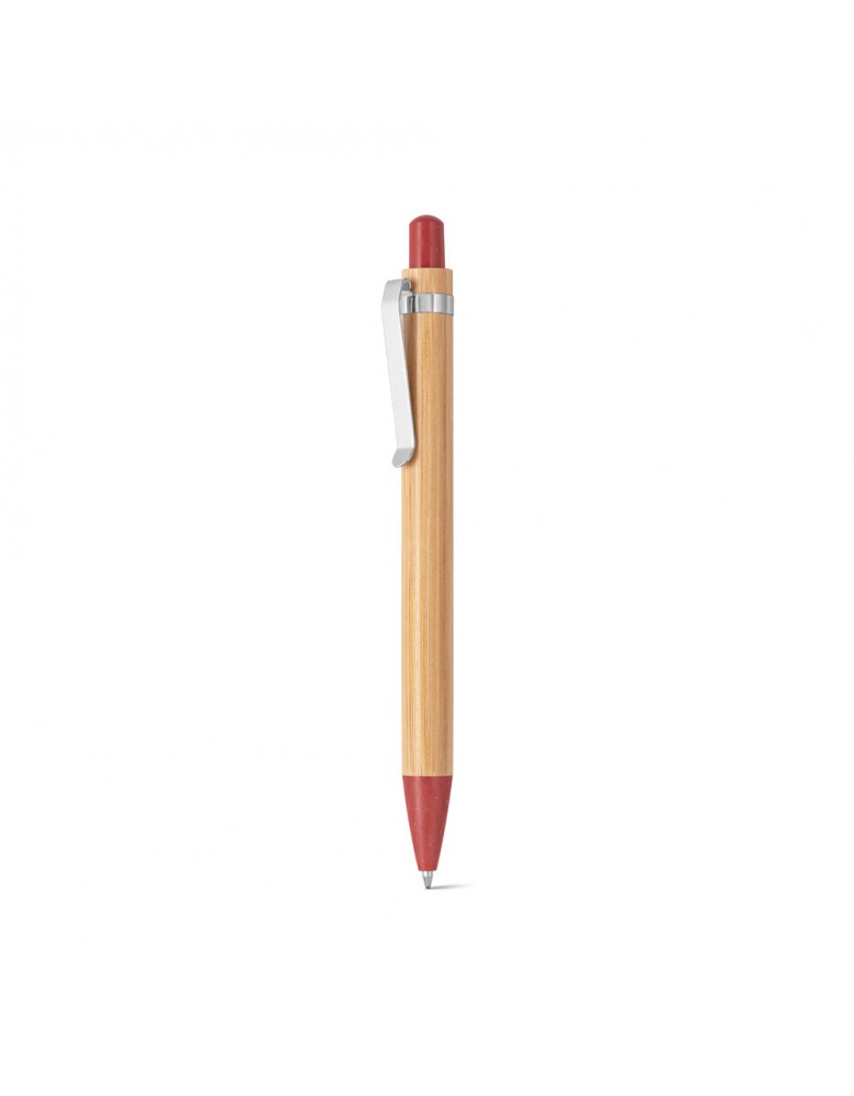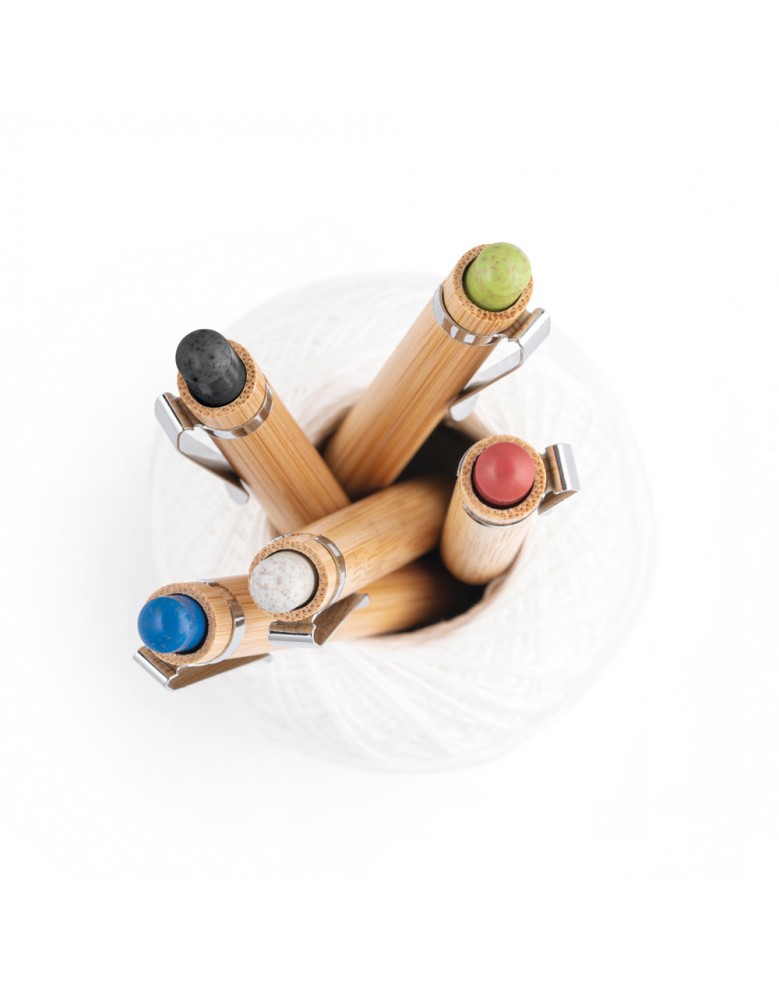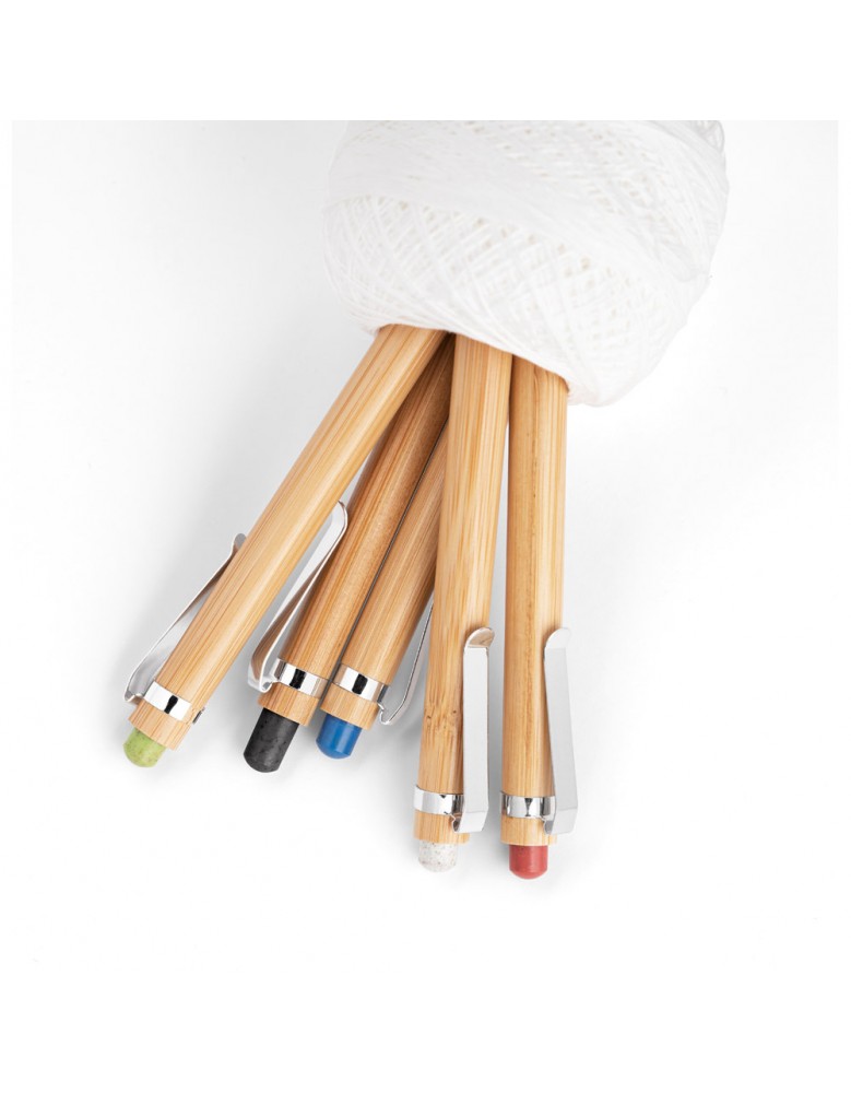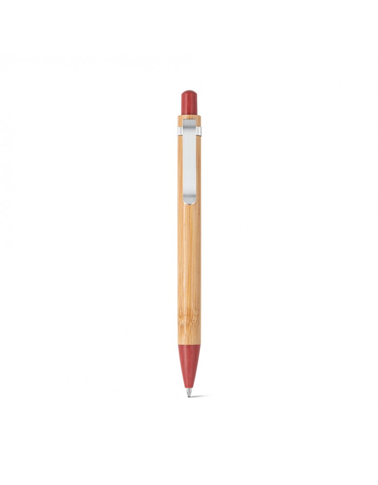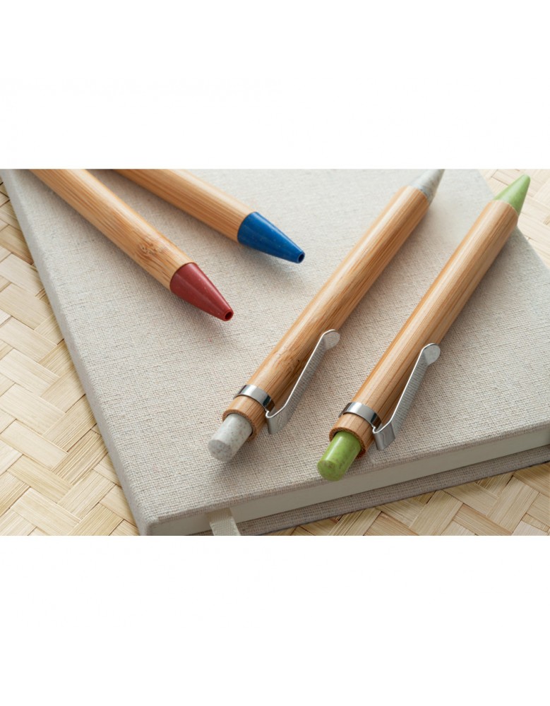 Esferográfica em bambu e clipe em metal. Os elementos coloridos são em fibra de trigo e ABS. Até 1,5 km de escrita. ø11 x 142 mm