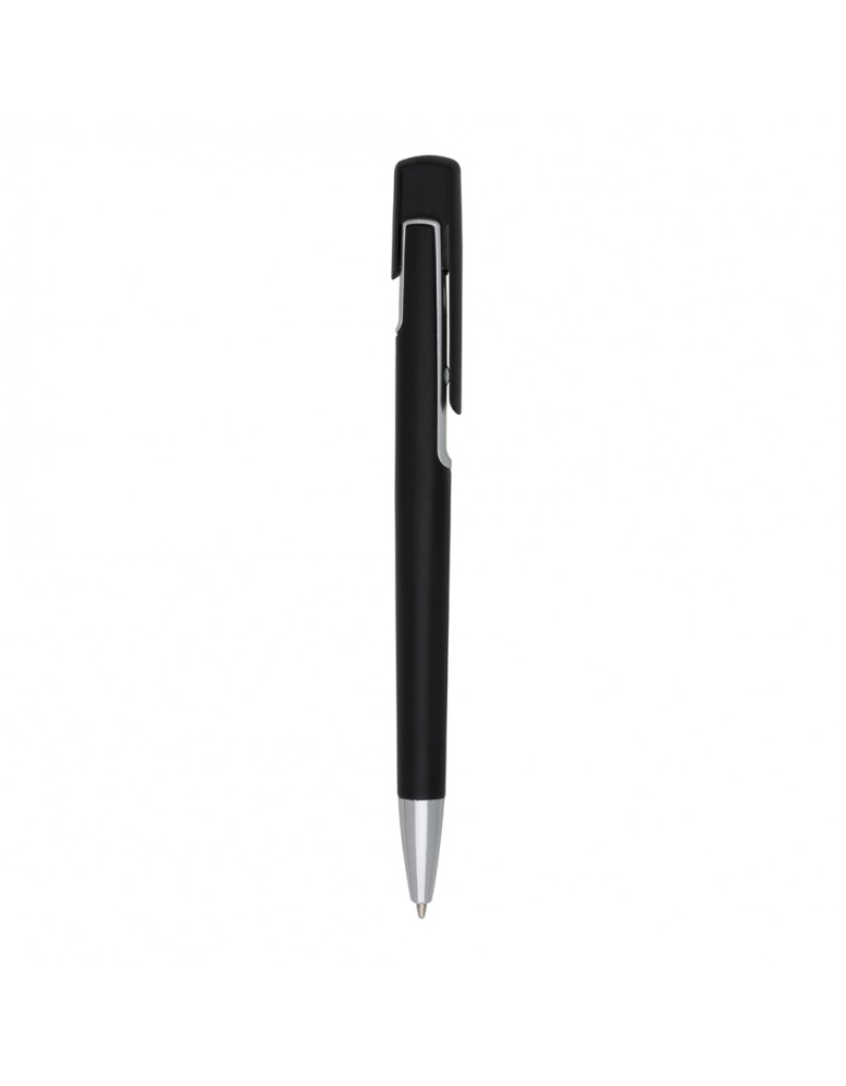 Caneta plástica com carga esferográfica azul e acionamento por clique.