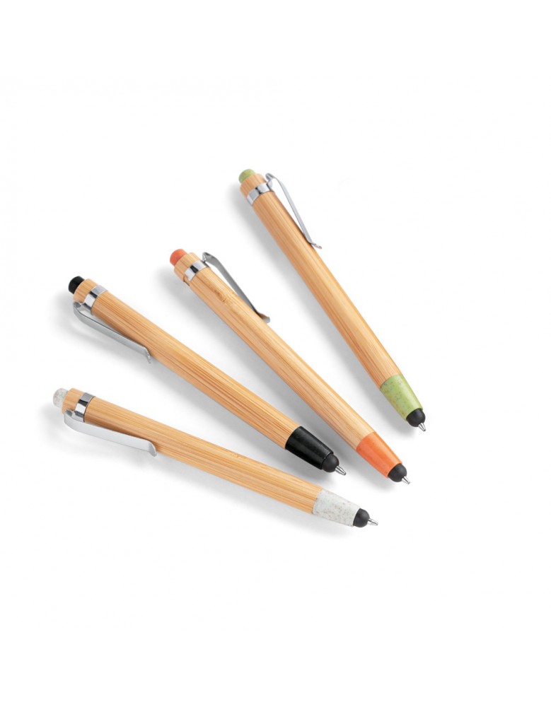 Esferográfica em bambu com ponteira touch e clipe em metal. Os elementos coloridos são em fibra de trigo e ABS. Até 1,5 km de escrita. ø11 x 139 mm