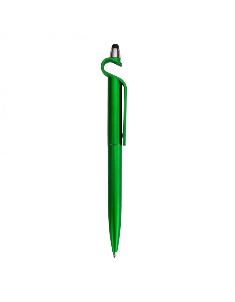 Caneta plástica com suporte para celular e touch screen. Carga esferográfica azul e acionamento por rotação.