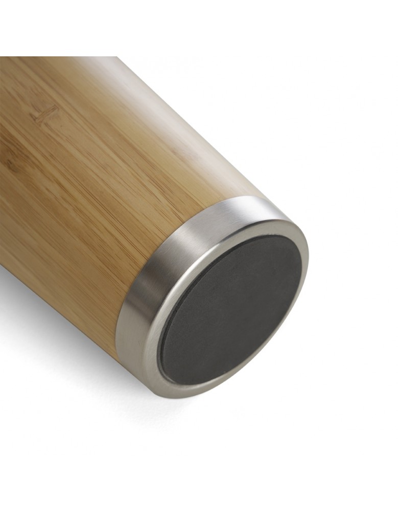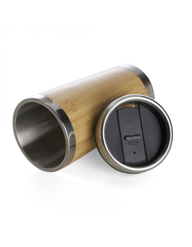 Copo Bambu de 500ml, parte interna em inox. Possui tampa com compartimento que pode ser aberto para beber.