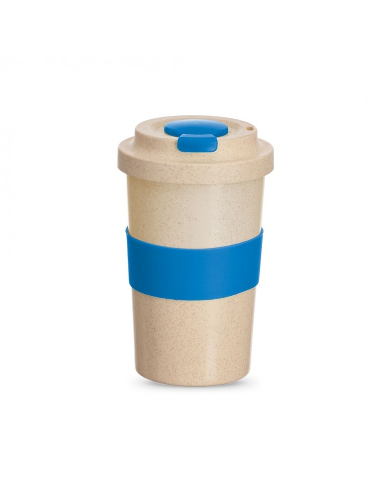Copo fibra de bambu 450ml com tampa rosqueável. Possui luva colorida e tampa protetora para o bocal ambos em silicone.