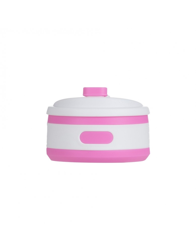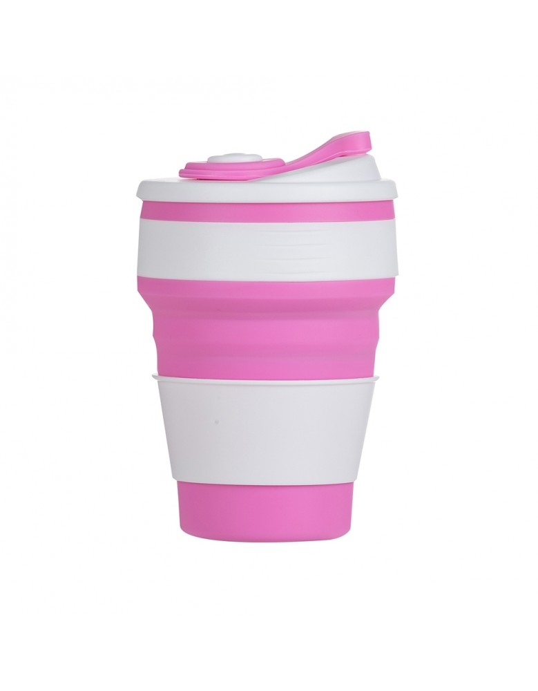 Copo retrátil 350ml de silicone, livre de BPA. Tampa plástica de encaixe com abertura para o bocal, acompanha "luva" plástica branca, evitando queimar as mãos com líquido quente.
