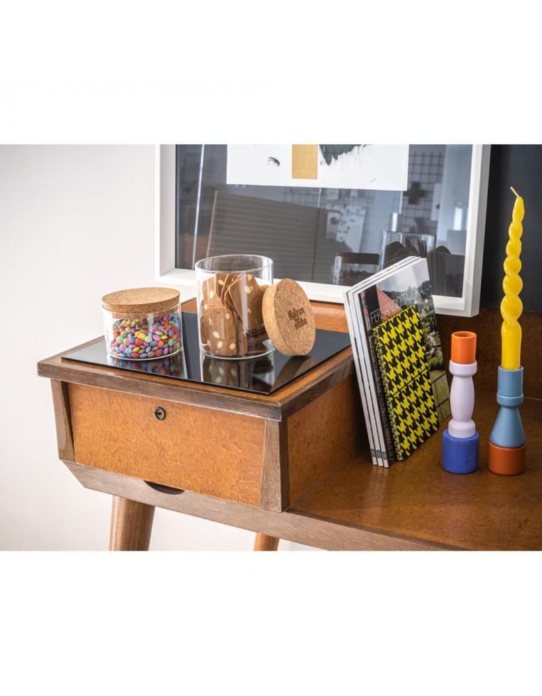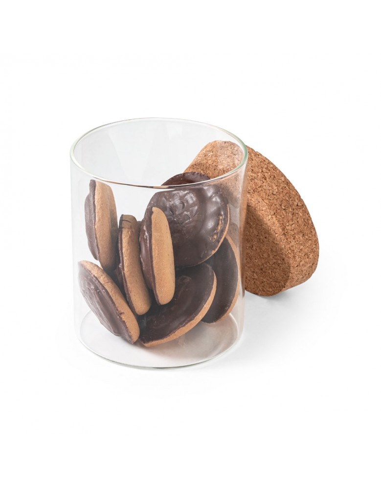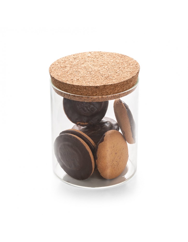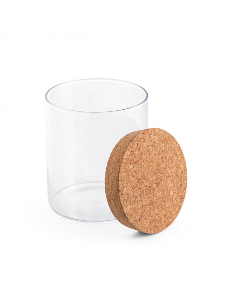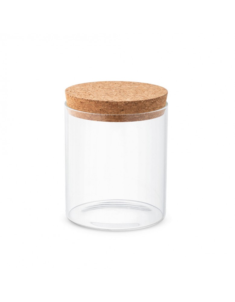 Frasco em vidro borosilicato e tampa de cortiça. Capacidade até 700ml. Food grade. Fornecido em caixa presente de papel craft. ø95 x 110 mm