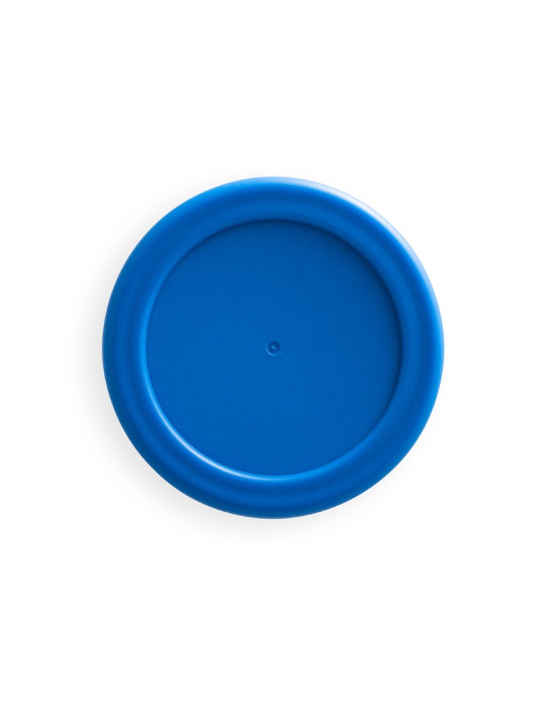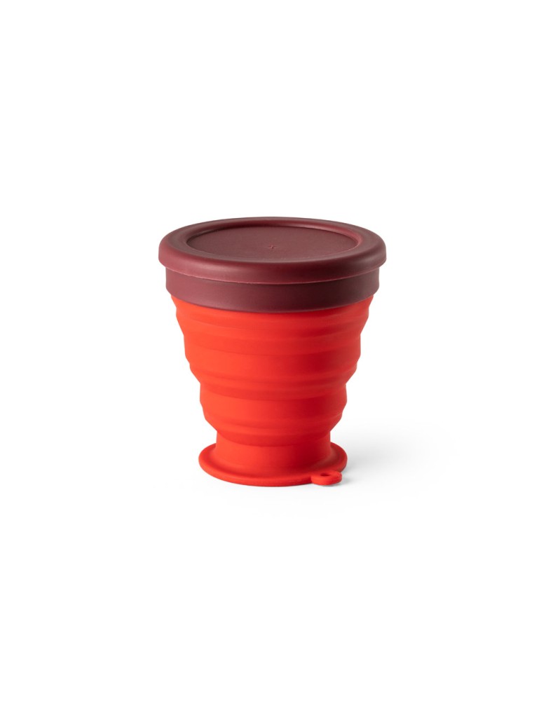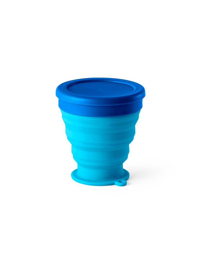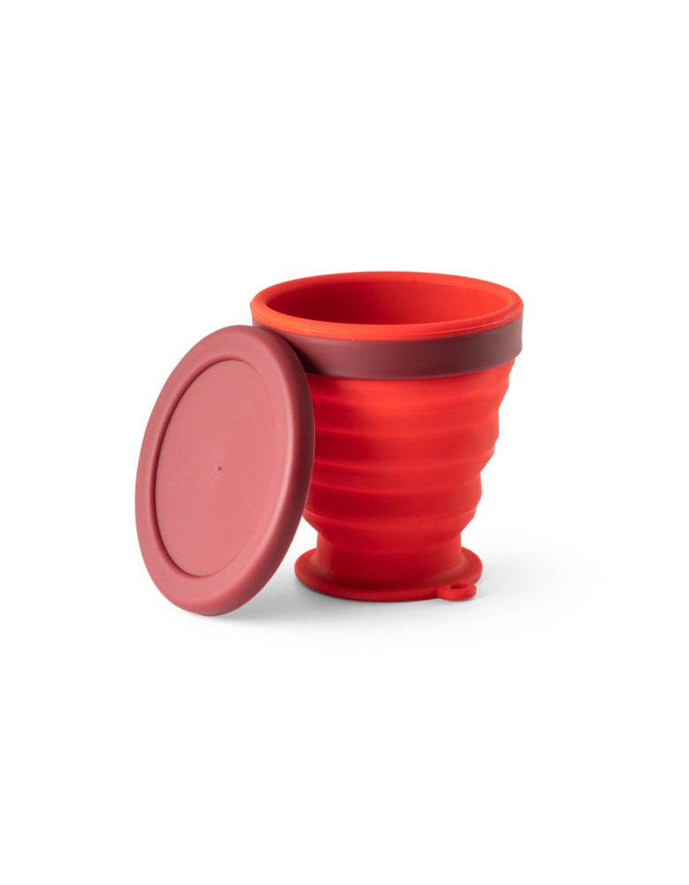 Copo de viagem dobrável em silicone com tampa em PP. Contém uma argola na base que serve como pega ou para pendurar.