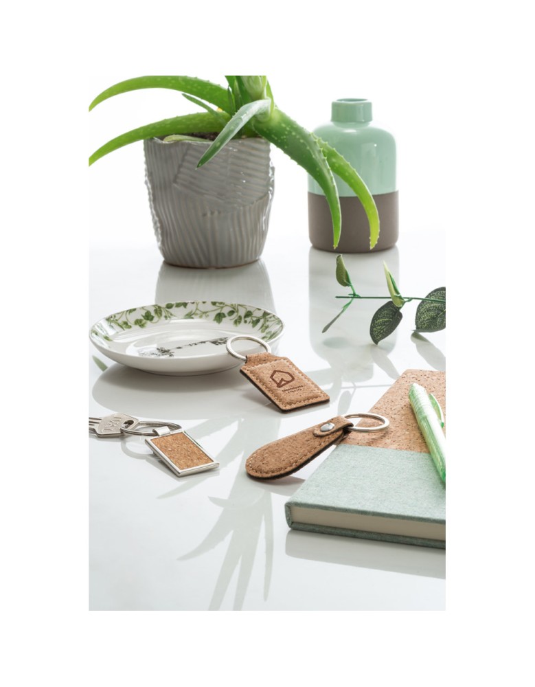 Chaveiro em cortiça em formato retangular. Fornecido com caixa de cartão kraft desmontada. 35 x 60 x 3 mm