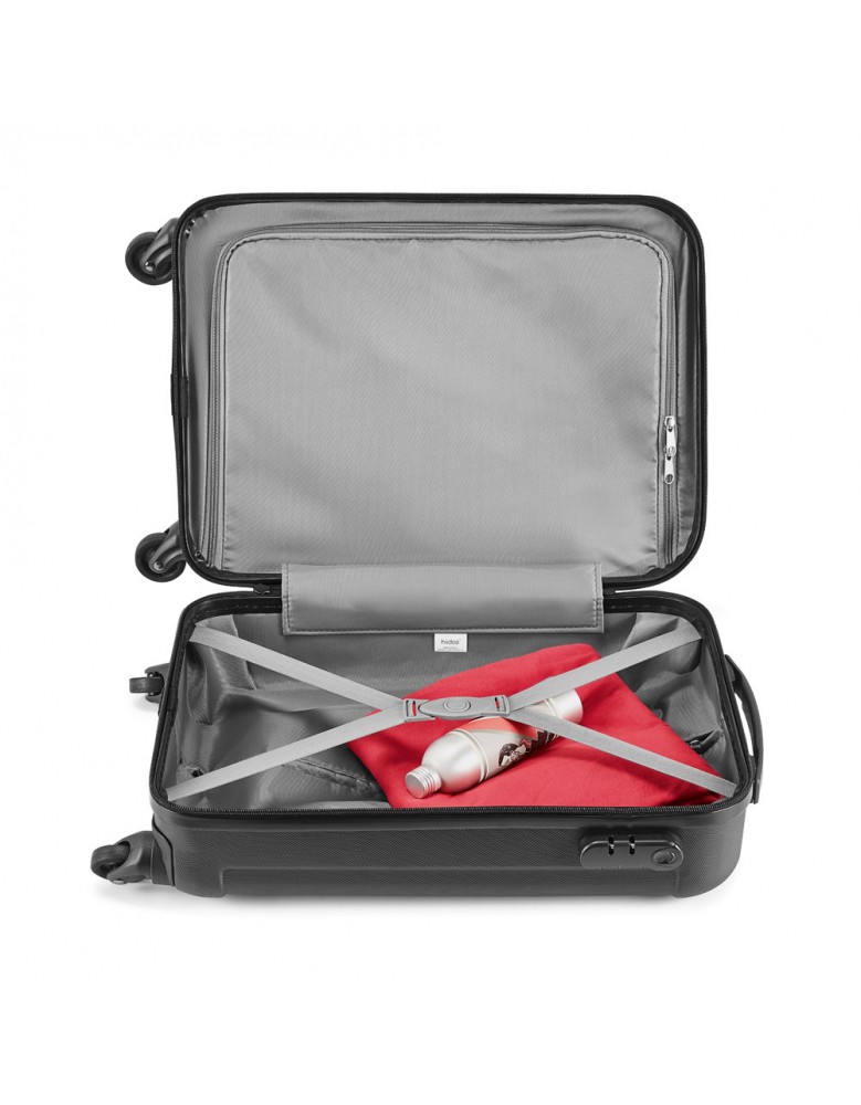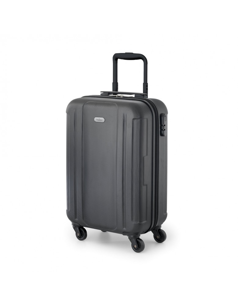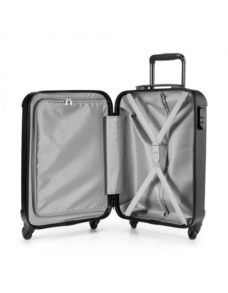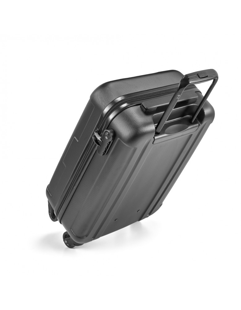 Mala de viagem executivo em ABS com interior forrado, com divisória. Fecho de segurança com senha na lateral, 4 rodas giratórias, pega extensível em alumínio, com mola (altura da pega estendida até 500 mm), e placa metálica removível com imã, para fácil gravação. Mala com capacidade até 31 L e peso de 2,25 kg. 355 x 550 x 200 mm | Placa: 50 x 20 mm