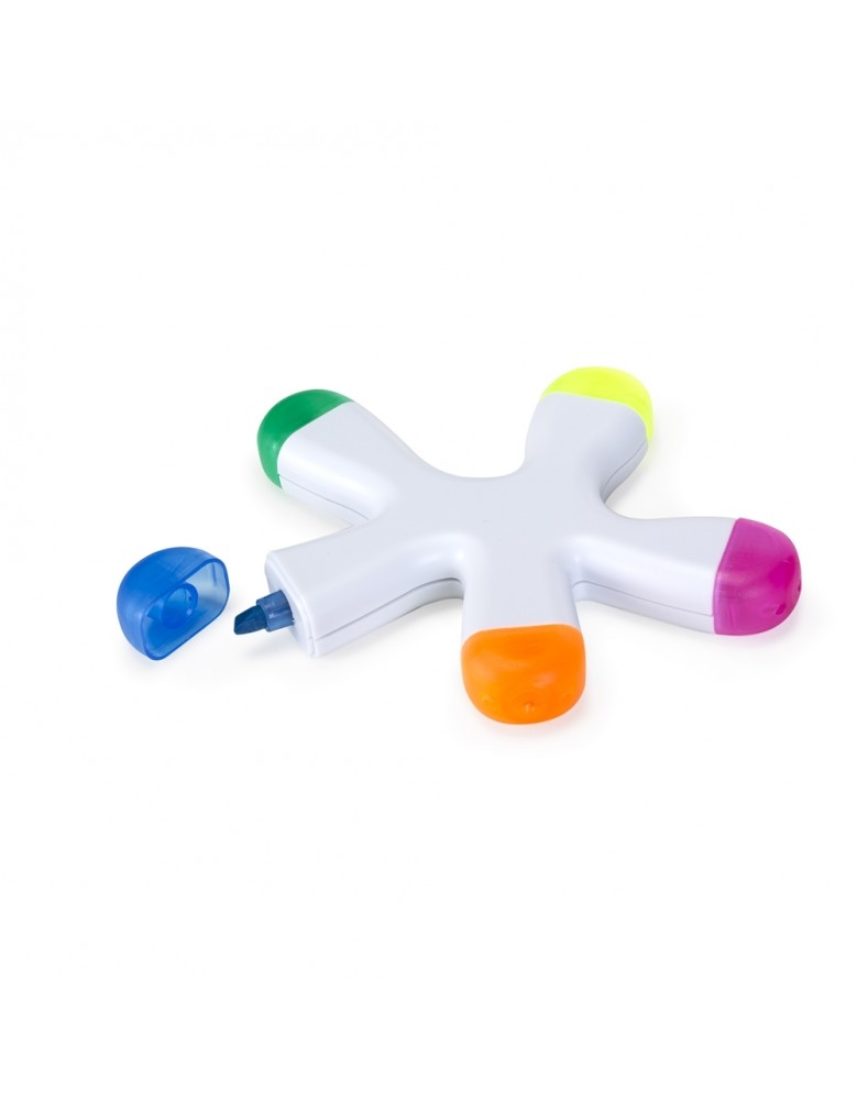 Caneta marca texto em formato splash na cor branca de frente e verso liso, possui as cores: azul, amarelo, laranja, rosa e verde.