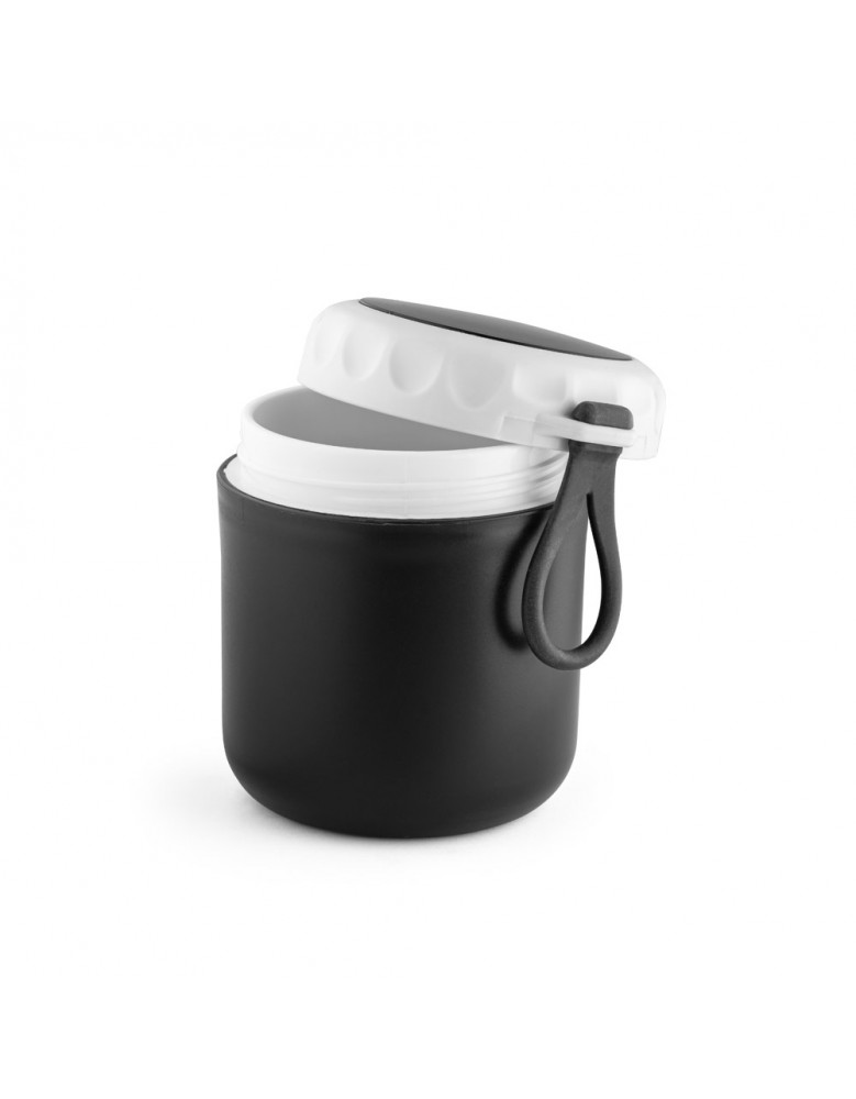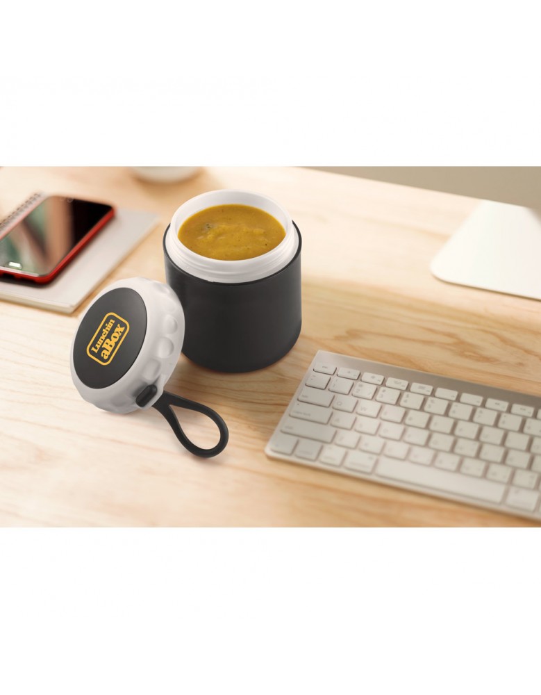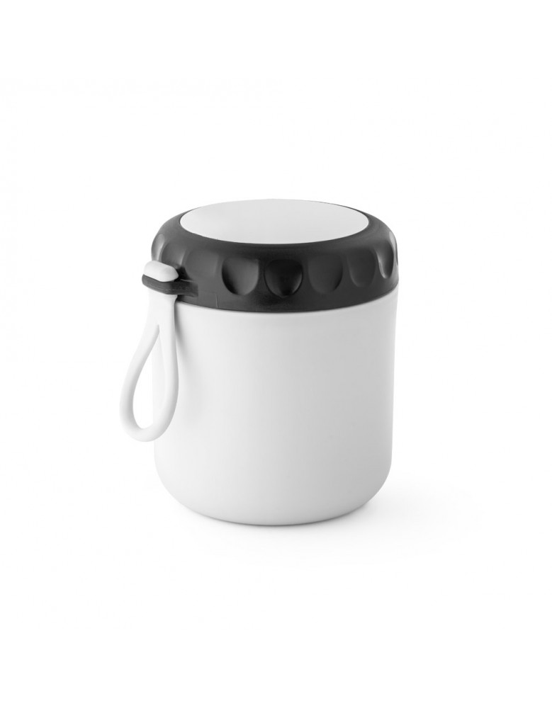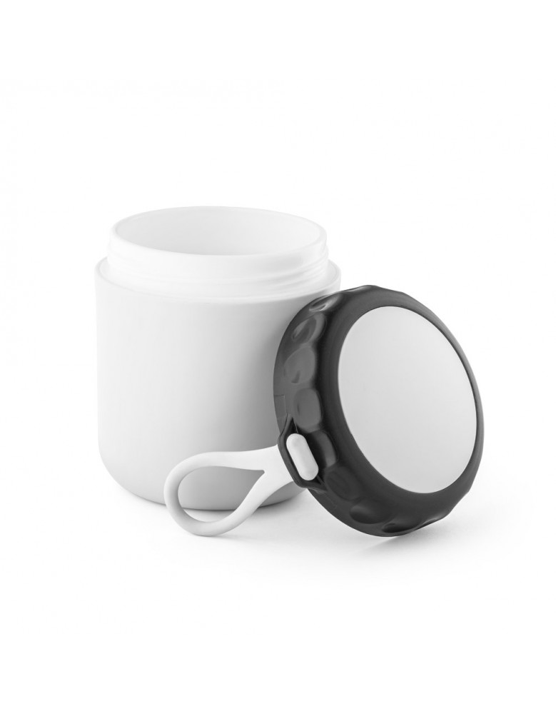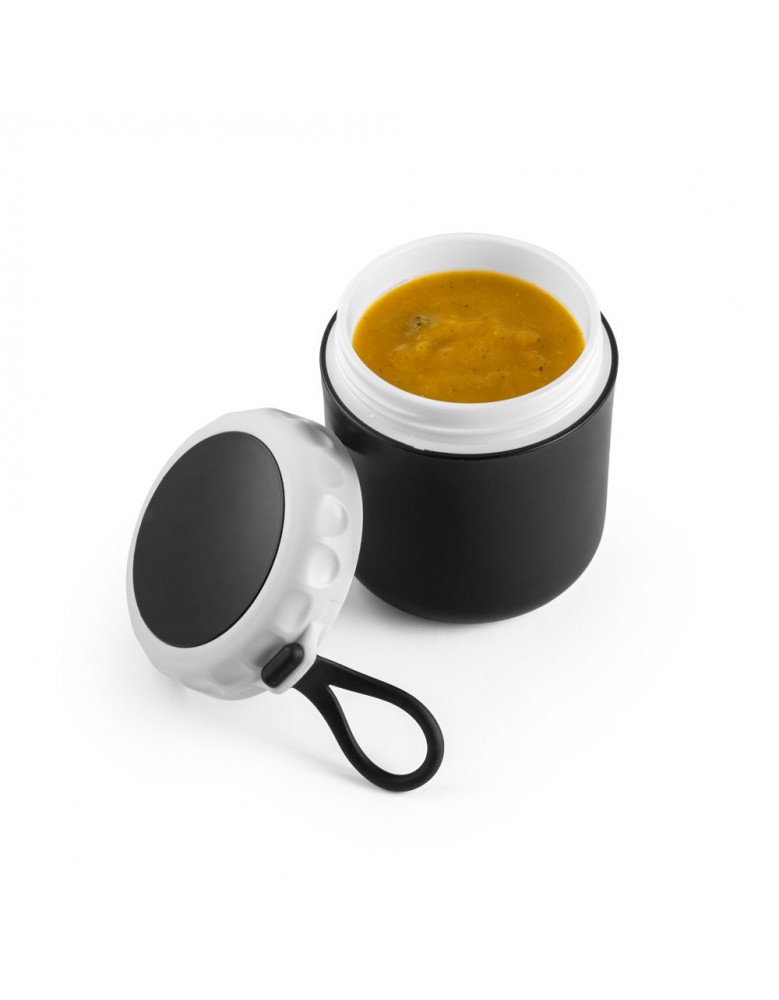 Recipiente térmico em PP com parede dupla. Com pega para transporte em silicone, ideal para refeições. Food grade. Capacidade até 380 ml 90 x 105 mm
