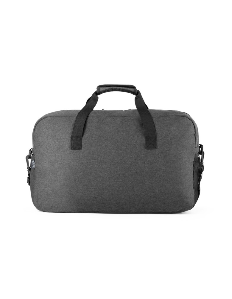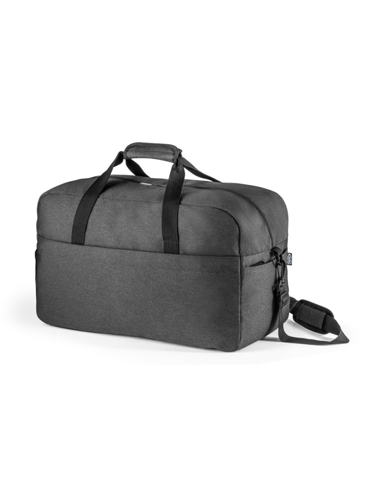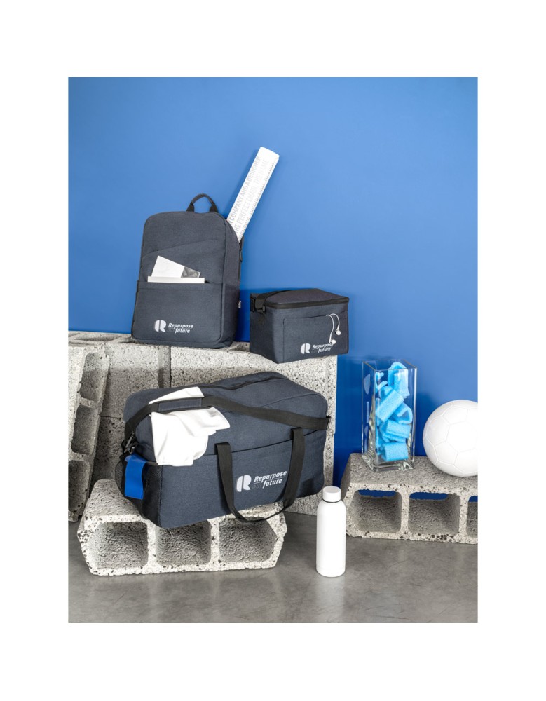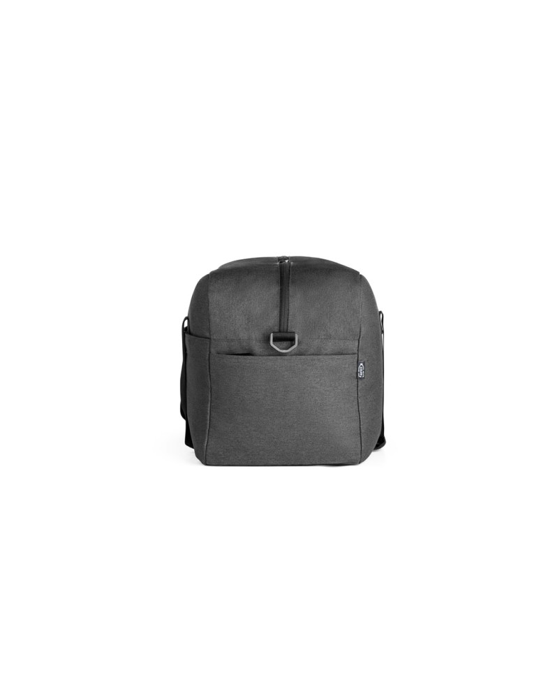 Bolsa esportiva em rPET 600D com interior forrado e fundo com placa semi-rígida. Compartimento principal e bolso frontal com fecho e dois bolsos laterais, um em rede e outro com fecho. A bolsa tem alça de ombro removível e ajustável em webbing com reforço almofadado. 500 x 300 x 230 mm