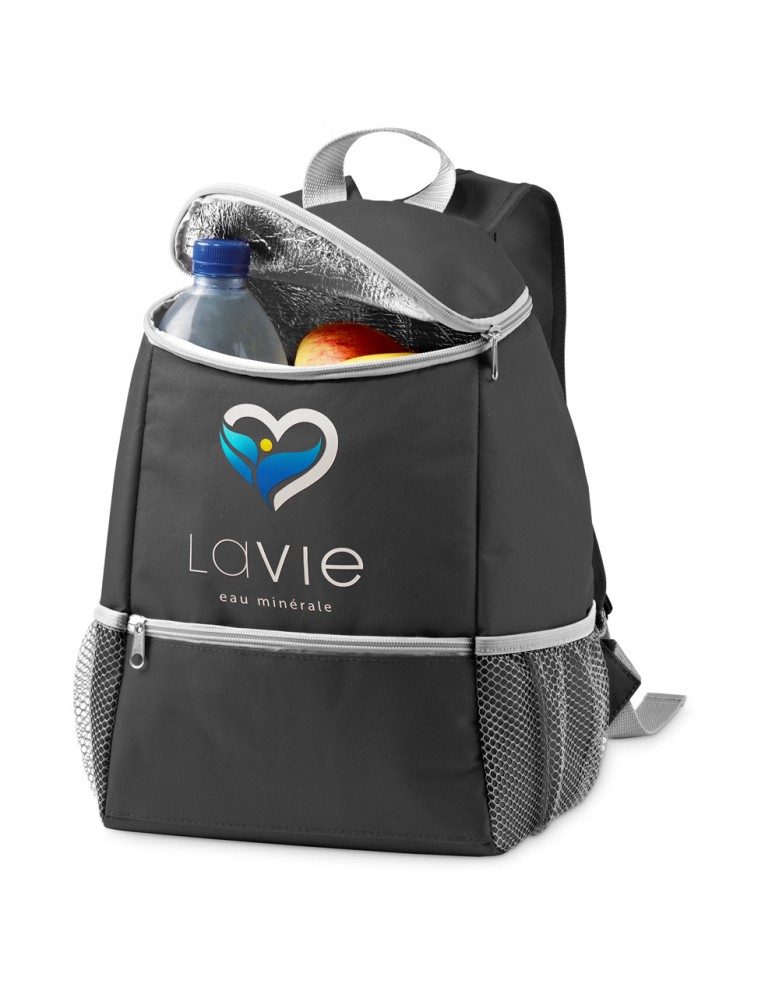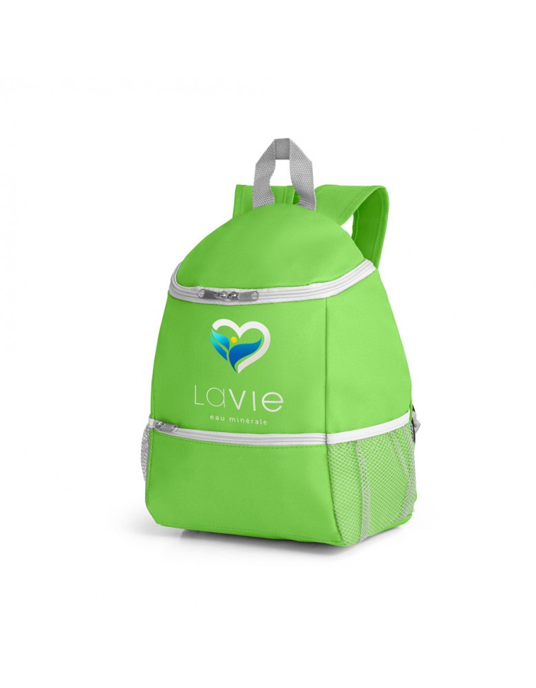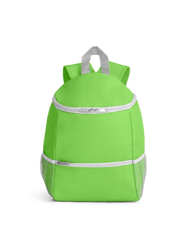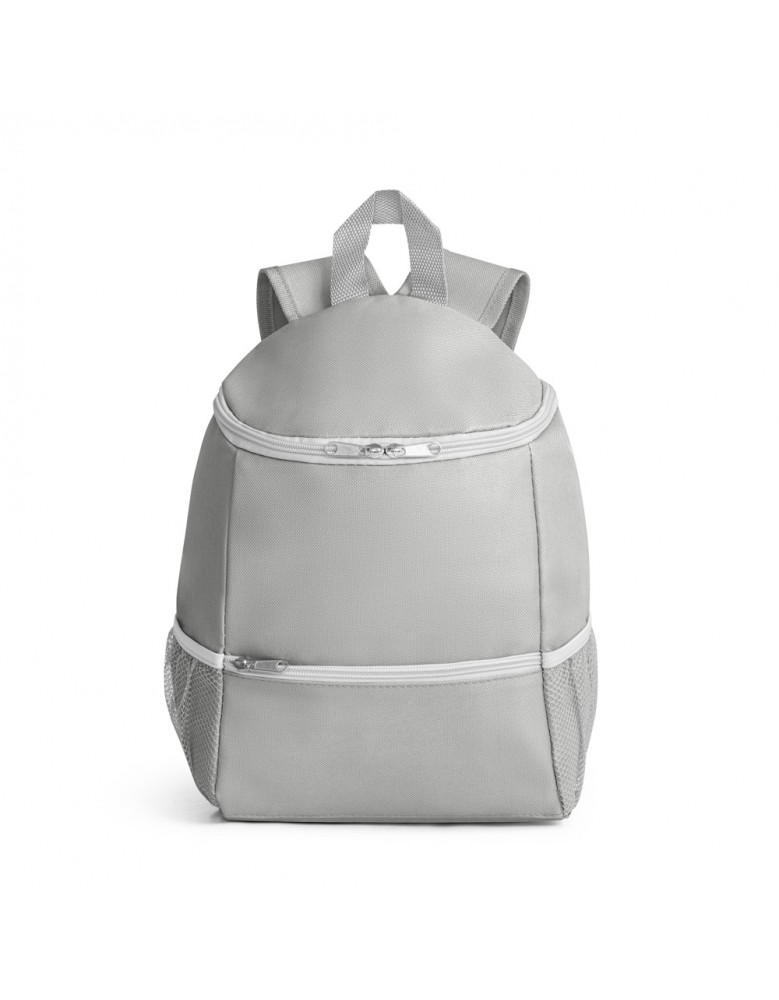 Mochila térmica em 600D com capacidade até 10 L. Inclui um bolso frontal com zíper e dois bolsos laterais em tela. Food grade. 280 x 340 x 140 mm