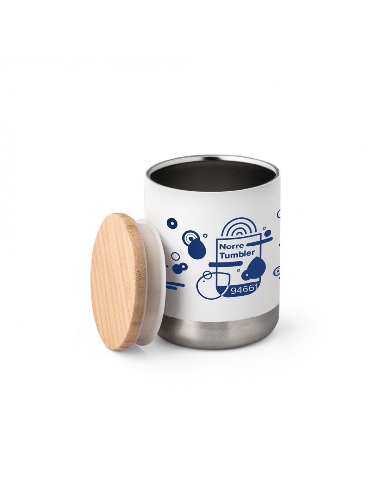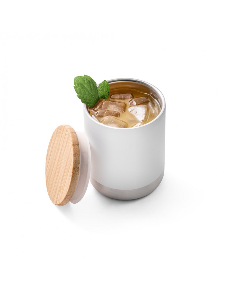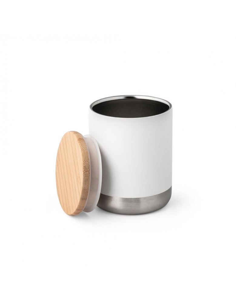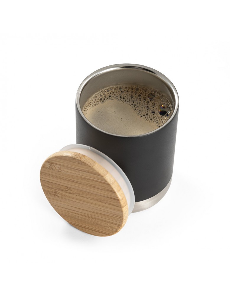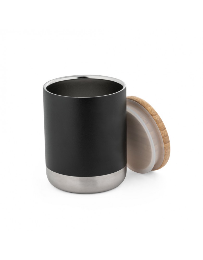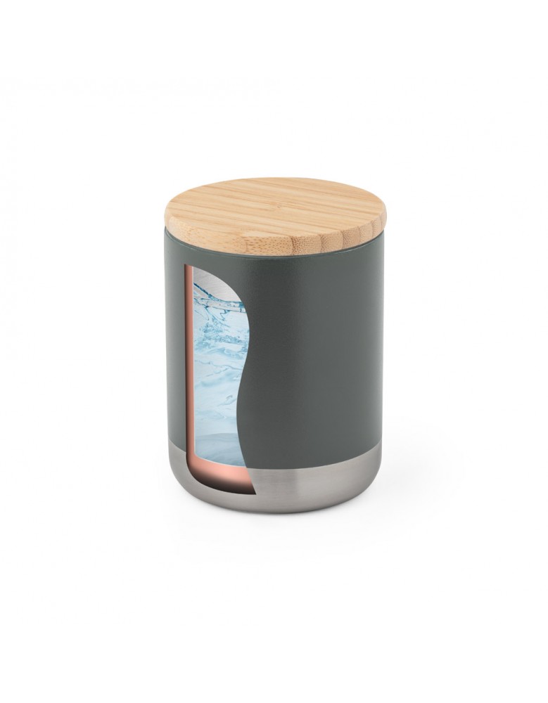 Copo em aço inox com parede dupla isolada a vácuo, parede interna revestida de cobre e tampa em bambu com vedante de silicone para proteção extra. Tem capacidade até 370 ml e mantém as bebidas quentes por 5 h e frias por 24 h.