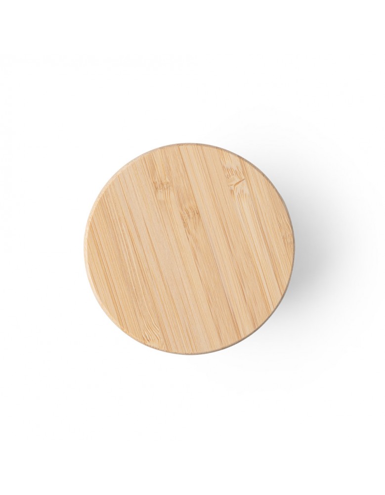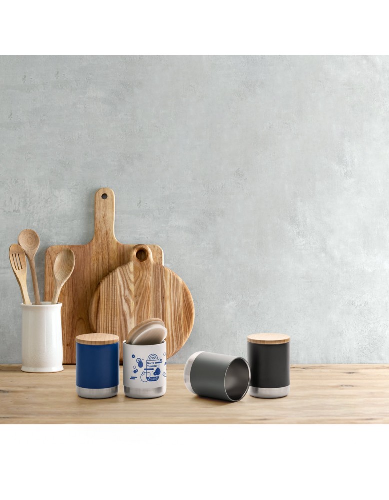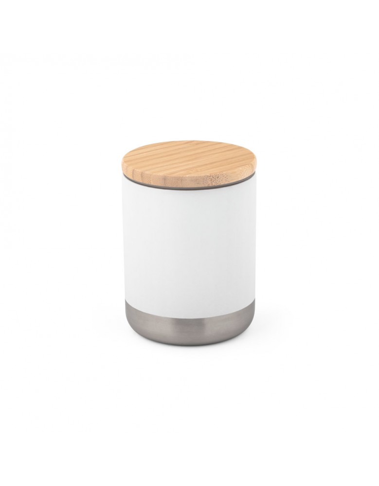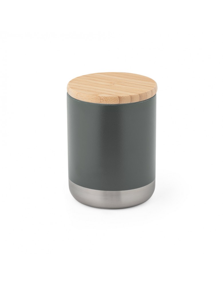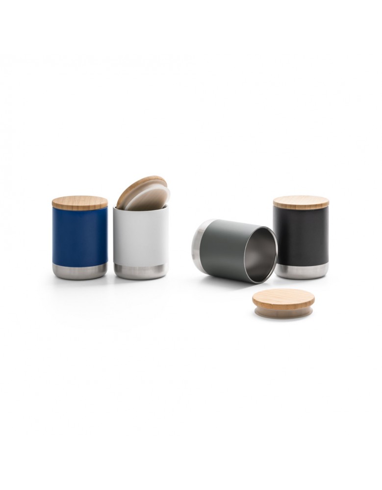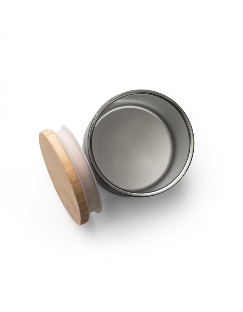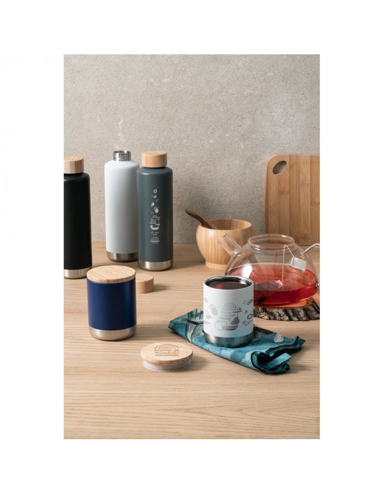 Copo em aço inox com parede dupla isolada a vácuo, parede interna revestida de cobre e tampa em bambu com vedante de silicone para proteção extra. Tem capacidade até 370 ml e mantém as bebidas quentes por 5 h e frias por 24 h.